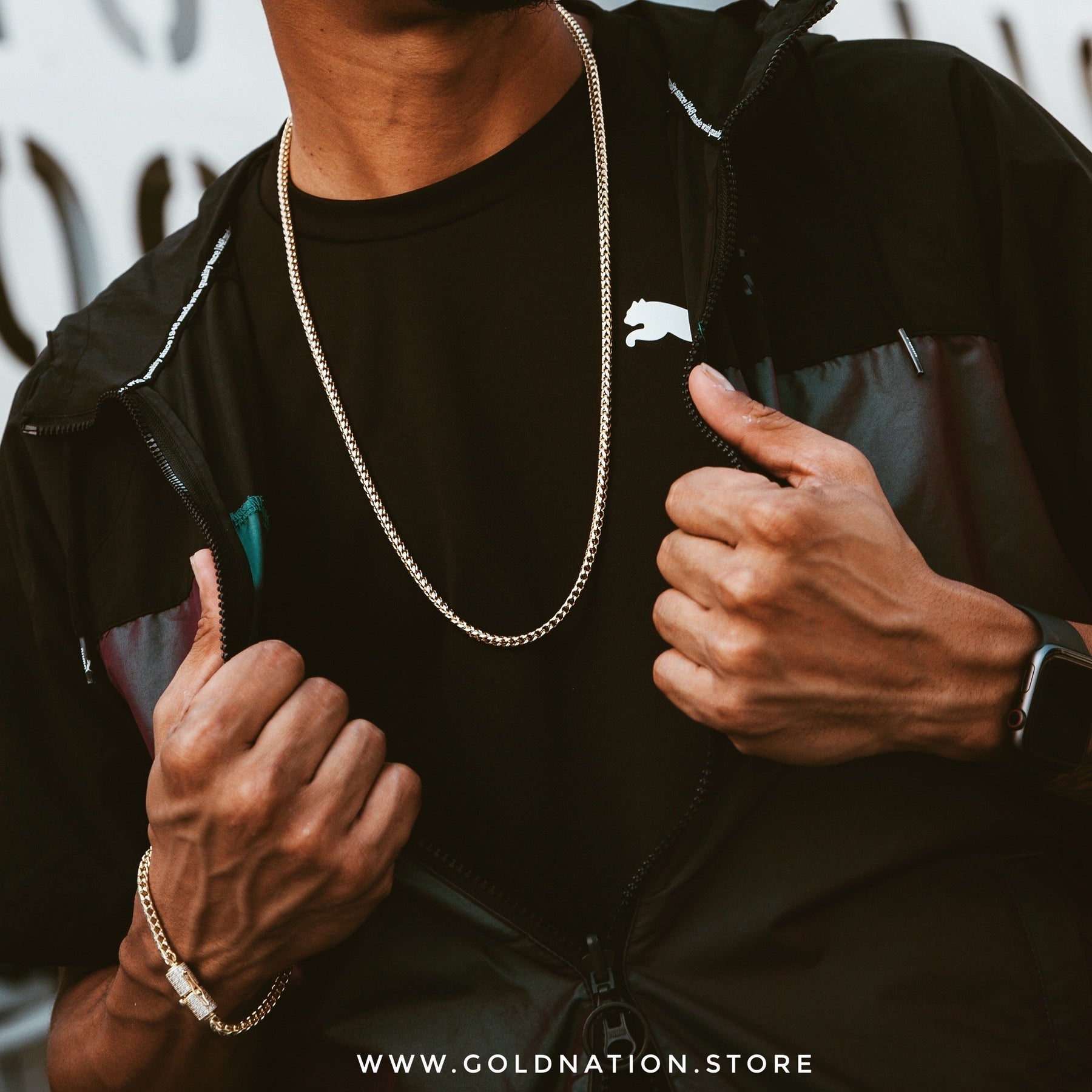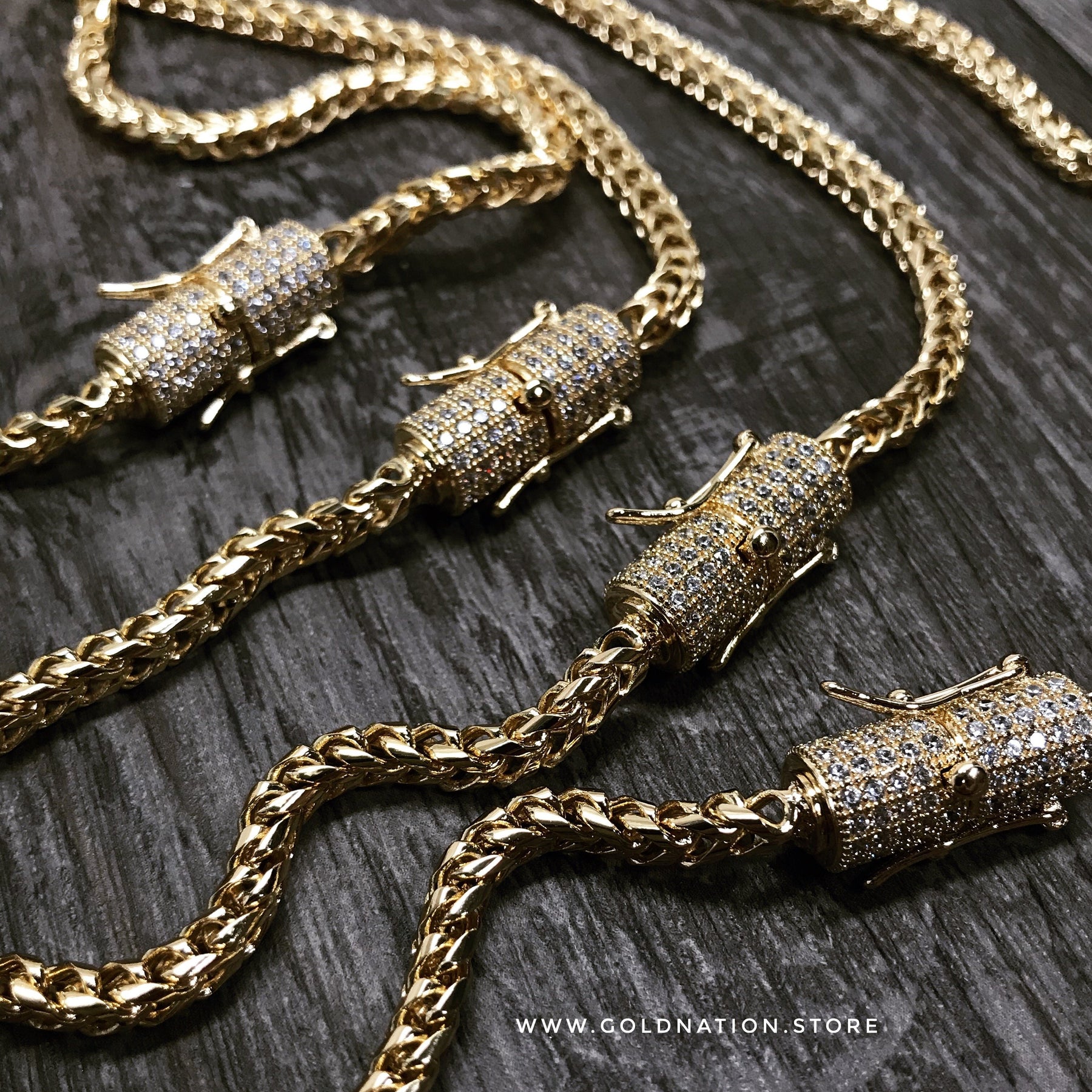 Gold Nation's Cuban Link Chain is now available in gold color, but the best of all, of top quality. Our pieces are handcrafted with the unique physical vapor deposition process. This chemical procedure consists of a vacuum coating process that produces a brilliant decorative and functional finish. We utilize a titanium nitride that provides an extremely durable coating. This coating is far more resistant to corrosion from sweat and regular wear than gold plating. In other words, more resistant, more durable. If you know what a gold plate is, you will realize that this is the highest quality in the market.